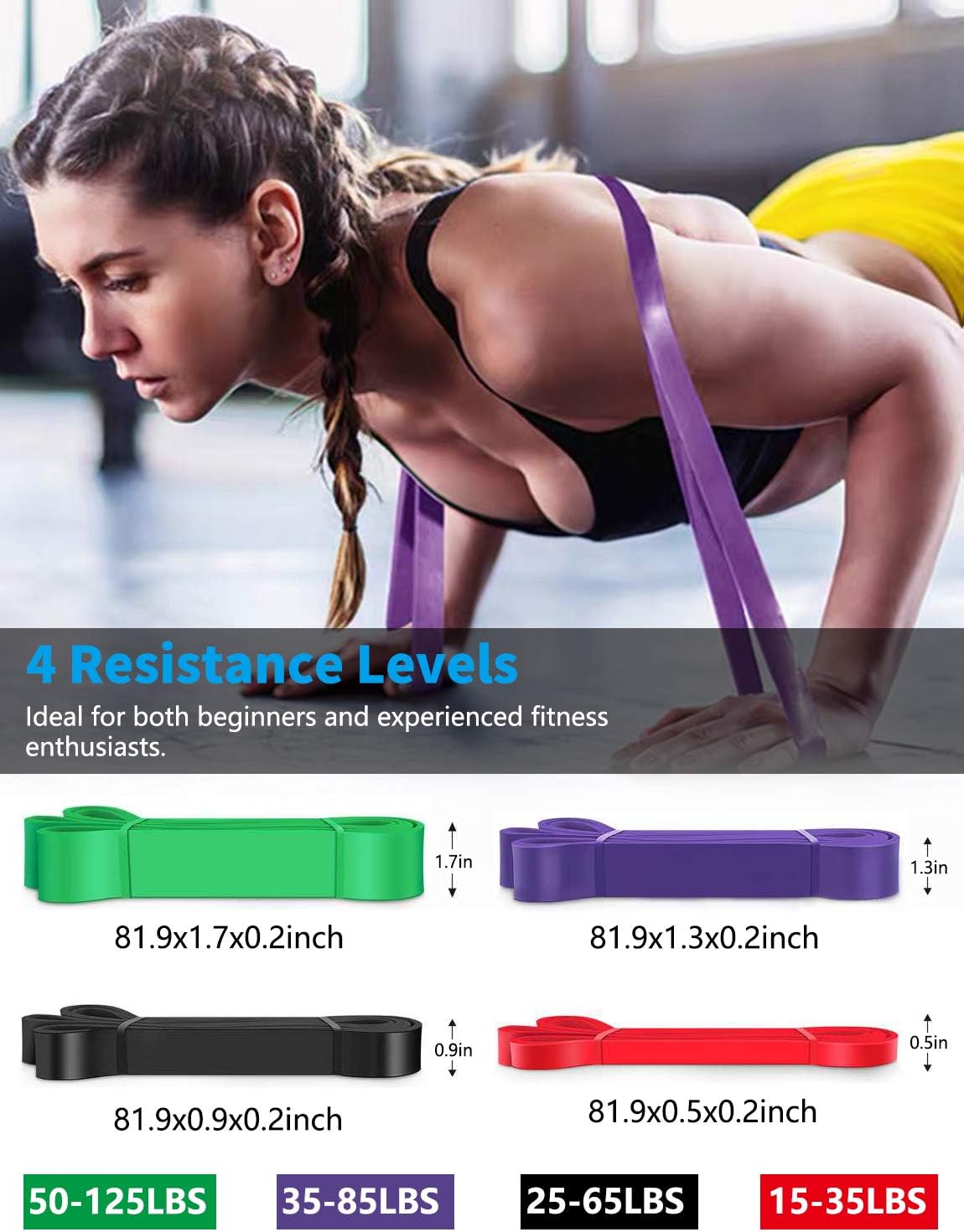 【Universal Partner for Workout】Each exercise band offers different level of resistance, both for heavy duty pull up training, adding resistances to bench press, squats, push up, Olympic lifts. A must have sports accessory for Pilates, calisthenics, yoga, powerlifting, crossfit etc. 【Fit All Exercise Levels】Whether calves or seasoned athlete, this resistance bands will help to take your fitness training & rehab to the next level. Use these workout bands individually or combine to receive additional tension levels. Exercise safely on your own, anytime & anywhere. 【Durable Natural Latex】Red:15-35 lbs., Black:25-65 lbs., Purple:35-85 lbs., Green:50-125 lbs. Our pull up bands can be stretched repeatedly year after year. No odor, no poison. Environmentally friendly latex material isn't only durable, but also healthy. 【Meet 90% of the Body Muscle Training】Our stretch bands are best for toning up your arms, chest, core, back, ABS, butt, legs or more; Obviously improves the muscle strength, enhances the body flexibility. Also can be used for rehabilitation training & physical therapy. 【Suitable For Daily Use】Each fitness bands is carefully constructed to resist snapping and breaking,which are able to withstand intense daily exercise sessions. Now enjoy the exercise with WHATAFIT pull up bands resistance bands!